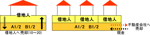 共有土地を売却し現金で分割する方法です。借地人に購入意思や資力がない場合、複数の借地人が存在する土地等、また早期に売却を図りたい場合などは、売却金額は低くなりますが一括して底地買取専門の不動産会社へ売却することも検討しなければなりません。