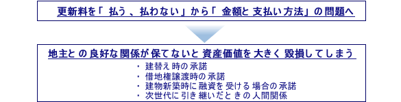 借地契約満了時の更新料をめぐる問題は、かなり昔から、その支払い義務の有無やその金額を廻って地主と借地人との間に考え方の相違や紛争も多く見受けられました。しかし現在は更新料支払いの有無を巡る争いは少なくなり、更新料の金額や支払い方法を巡る協議が多くなっております。この背景には、借地人の立場から「将来の建替えや譲渡する場合の地主の承諾や相続等による世代交代、人間関係等を勘案すると、目の前の更新料を巡って地主と争っても利益になるどころか、借地権の価値を毀損しかねない」という意識が根付いてきたということが言えるでしょう。